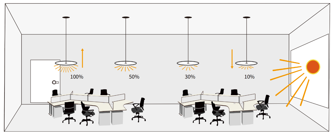 Daylight Harvesting - Känner automatiskt av intensiteten av omgivande ljus och justerar dynamiskt ljusstyrkan på lampor för att optimera energiförbrukningen;