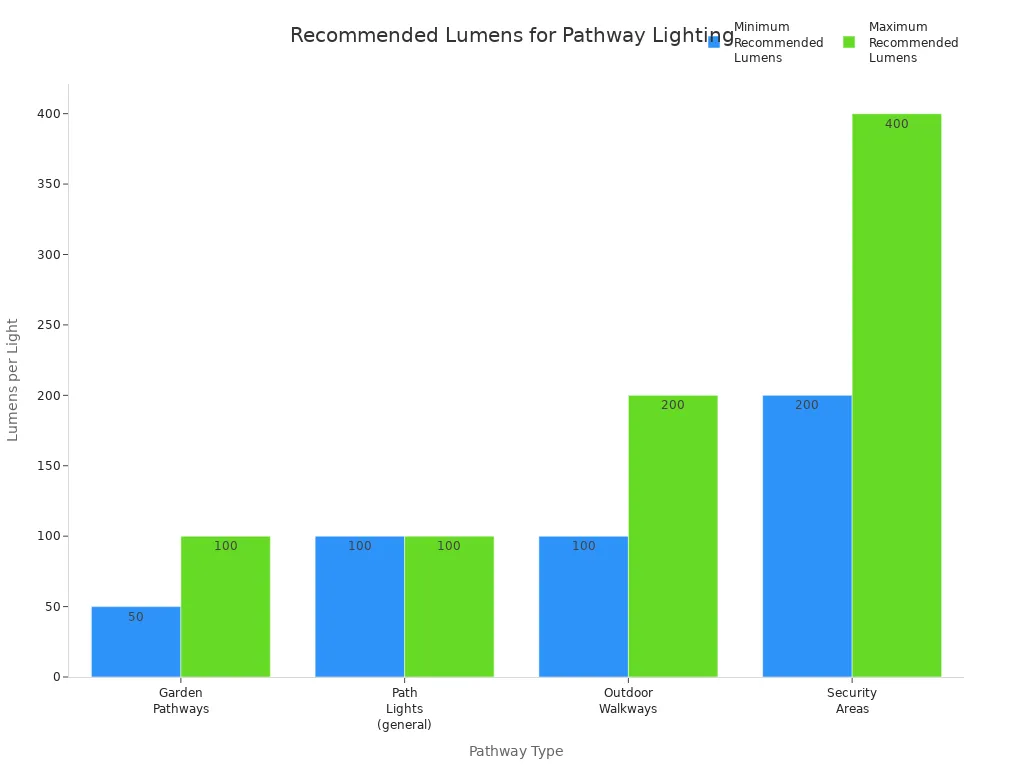 Det är viktigt att ha säkra stigar utanför. Banbelysning hjälper människor att se var de ska gå. Den stoppar också resor och fall. För trädgårdsgångar, använd lampor med 50–100 lumen. Gångbanor behöver 100–200 lumen för bra ljus. Om du vill ha mer säkerhet, använd 200–400 lumen per ljus. Sätt utomhus LED-lampor 6–8 fot från varandra för jämnt ljus. Smala stigar behöver ljus närmare varandra. Breda stigar kan ha ljus längre ifrån varandra. Placera lampor cirka 14 tum över marken. Detta ger en direkt stråle och gör att banan ser snygg ut.
