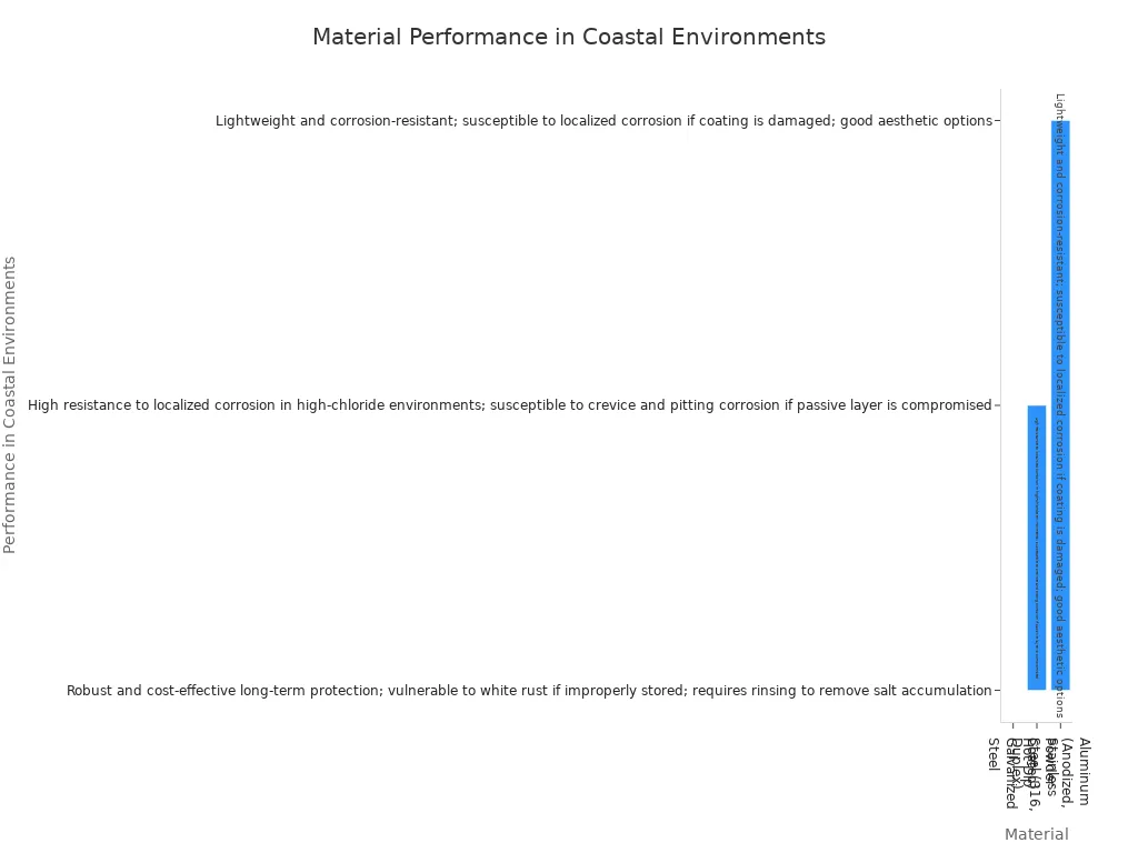Tillverkare använder pulverlack och förseglade lock för att få lamporna att hålla längre. Dessa funktioner hjälper led väderbeständig belysning att överleva stormar, våt luft och saltstänk. Du kan se hur olika material fungerar nära havet i diagrammet nedan:
