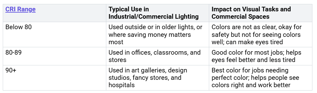 Lysdioder i långa, tunna armaturerbidra till att ge jämnt ljus. Detta gör det lättare för dina ögon och hjälper dig att se bättre. I företag är färgnoggrannhet viktig. Industriell linjär belysning har vanligtvis enCRI mellan 80 och 90. En CRI på 80 eller mer är bra för de flesta jobb. En CRI på 90 eller mer är bäst för platser där färgen måste vara exakt. Högre CRI betyder bättre färg, mer komfort och säkrare arbete. Detta hjälper människor att göra sitt jobb bättre.