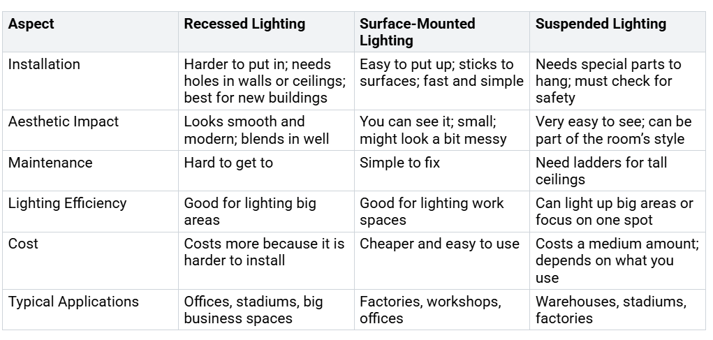 Ytmonterad linjär belysning går direkt på tak eller väggar. Denna typ används mycket i företag. 2023 gjorde det uppöver halva marknaden.Många företag väljer det för att det är enkelt och billigt att sätta i. Dessa lampor ger jämnt ljus och fungerar bra på kontor, verkstäder och garage. Det är lätt att fixa dem eftersom du kan nå dem. Den här typen är bäst för platser där du behöver snabb och enkel installation.